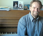 Posed, color photo of EIU music history teacher, Peter Loewen. He is facing the camera, but seated in front of a piano with photographs of children and a file folder with paperwork displayed on top. He is smiling and wearing a blue button-down collared shirt.
