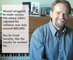 Posed, color photo of EIU music history teacher, Peter Loewen. He is facing the camera, but seated in front of a piano with photographs of children and a file folder with paperwork displayed on top. He is smiling and wearing a blue button-down collared shirt. There is a text box on the left-hand side that reads “Mozart struggled to make money. His salary, when adjusted for inflation was only around $80,000. But he lived lavishly, like the royalty he worked for”.