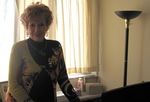 Portrait, color photo of EIU voice teacher, Marilyn Coles. She is seen standing in front of a window and next to a floor lamp. She is wearing a multi-colored cardigan.