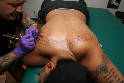 Candid, color photo of the tattoo outline being completed. The tattoo artists facial side profile can be seen, and they are seen wearing purple gloves while holding the tattoo gun to the skin. The tattoo receiver can be seen shirtless lying face down on a table with the stencil on their upper back.