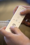 Color, close up photo of a student's hands holding a Wii remote control. They are playing video games in Stevenson Hall.