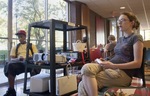 Color, candid photo of two students playing video games in Stevenson Hall. The student on the left is wearing a red hat, a white tee shirt, and shorts. He is holding a Wii remote control in his hands. The student on the right is wearing a grey graphic tee shirt and khaki capris. She is holding a Wii remote control in her hands. Between them is a set up for projector equipment.