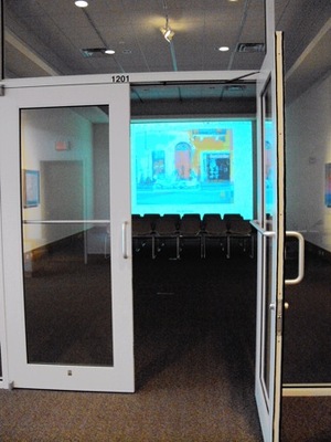 Color photo of the entrance to William Hubschmitt's Retrospective Exhibition at the Tarble Arts Center. There is an open door leading into a room with chairs and a projector.