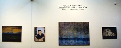 Color photo of a wall of four art pieces from William Hubschmitt's Retrospective Exhibition at the Tarble Arts Center. From the left, the first piece is dark and abstract. Next is a portrait of a man with short, dark hair and a dark shirt. The next piece is an abstract piece with blue tones. The last piece is dark with a light-colored focus in the middle. The wall above these pieces reads "William Hubschmitt: A Retrospective Exhibition; August 21 - September 25, 2010."
