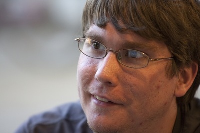 Close up, color photo of a student playing video games in Stevenson Hall. He is wearing small wire framed glasses and a grey tee shirt.