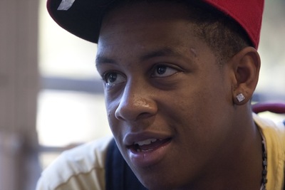 Color, close up photo of a student playing videos games in Stevenson Hall. He is wearing a red baseball cap and has on a yellow shirt.