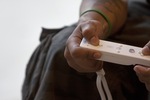 Color photo of a student's hands holding a Wii remote while playing video games in Stevenson Hall.