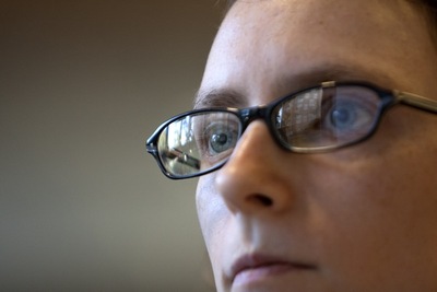 Candid, color close up photo of a student playing videos games in Stevenson Hall. The student is wearing small tortoiseshell glasses.