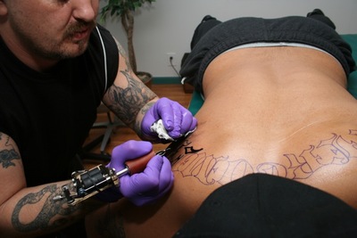 Color, candid photo of the tattoo artist tattooing the outline of their design. The tattoo receiver is shown shirtless lying face down with the stencil on their upper back. The tattoo artist's side profile is in view. They are wearing purple gloves and holding their tattoo gun in one hand and a paper towel in the other.