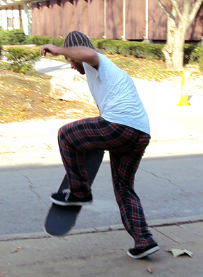 Color, candid photo of student Elliot Fitzgerald skateboarding outside. He is wearing a beaning, a white graphic tee shirt, and plaid pants.
