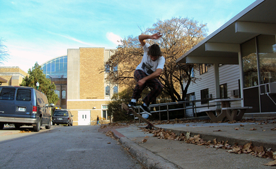Color, candid photo of student Elliot Fitzgerald skateboarding outside. He is wearing a beaning, a white graphic tee shirt, and plaid pants. The Booth Library can be seen behind him as well as some vans parked on the street.