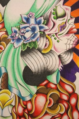 Color photo of an art piece titled "Sugar Skulls". This piece is extremely colorful and has been drawn with colored pencils. The art piece's subject is a decorated sugar skull. This piece was featured in the Illinois Art Association's Autumn Art Show.