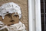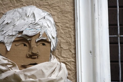 Color photo of an art piece titled "Recycled". The piece is composed of recycled materials including cardboard and printed paper. The materials combine together to create a human face peering to the side. This piece was featured in the Illinois Art Association's Autumn Art Show.
