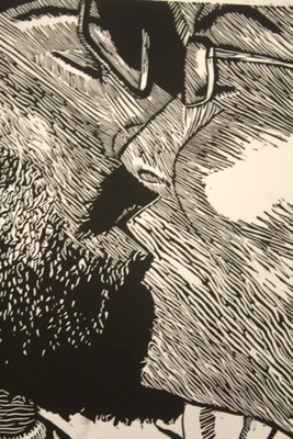 Color photo of an art piece titled "Kiss". This piece shows two people wearing glasses kissing each other. The piece is black, white, and tan. It was featured in the Illinois Art Association's Autumn Art Show.