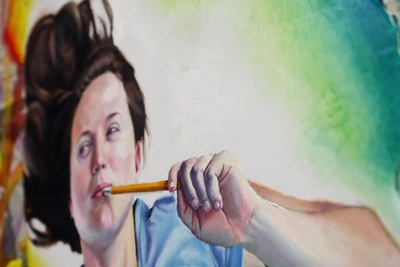 Color photo of an art piece titled "Introspection". The painting shows a woman in a blue tee shirt and short holding a pencil to her mouth as if to think. She is holding two books in her hand. The background is colorful and abstract. This close up shot is focused on the face and hands of the woman in the painting.