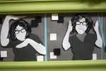 Color photo of an art piece titled "City Vogue". The piece is made of cut pieces of paper that form two figures voguing. The background is grey consists of black and white squares as well as blue lines. This piece was featured in the Illinois Art Education Association's Autumn Art Show.