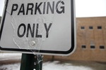 Color photo of a sheet of ice covering a black and white metal parking sign.