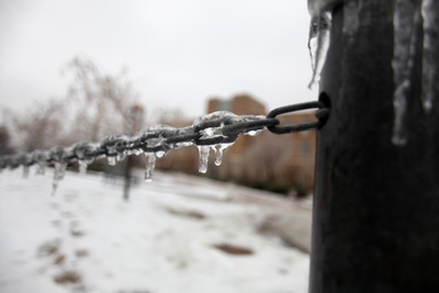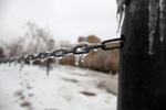 Color photo of icicles hanging off of a black metal chain.