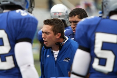 Candid, color photo of member of the Panthers football staff talking the Eastern Illinois University football team. He is seen wearing a headset and a blue Panthers pullover. The football players circled around him are wearing blue and white uniforms.