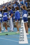 Color photo of Eastern Illinois University cheerleaders waiting on the sideline during a football game. They are wearing blue and white uniforms. The focus of the picture is a white and grey Panthers megaphone.