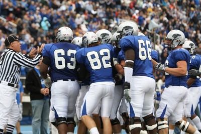 Candid, color photo of members of the Eastern Illinois University football team during a game conferring with a referee. The football players are wearing blue and white uniforms with helmets. The referee can be seen gesturing with his hands. He is wearing a black and white striped shirt, white pants, and a black ballcap.