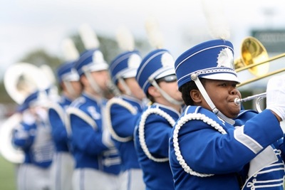 Candid, color photo of the Eastern Illinois University marching band playing during a football game. The band is seen wearing blue and white uniforms and are playing their instruments.
