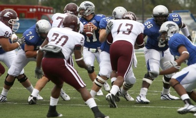 Candid action shot of players on the field during an Eastern Illinois University football game against Eastern Kentucky University. The EIU players are wearing blue and white. The EKU players are wearing burgundy and white.