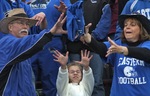 Candid, color photo of EIU football fans in the stands with their arms outstretched trying to catch a free t-shirt. The man on the left is wearing a hat, glasses, and a blue and black windbreaker. The child in the middle is wearing a white sweater and glasses. The woman on the right is wearing a blue EIU football t-shirt with a black long sleeve shirt underneath and a hat.