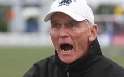 Eastern Illinois University's head coach Bob Spoo yelling at players on the field. He is seen wearing a white Panthers ballcap.
