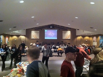 Candid, color photo of students gathered around a television in a hall to watch Super Bowl XLV. The students are sitting at tables with chairs facing a projector screening the game. There are also people gathered around snack tables.