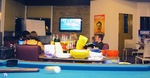 Candid, color photo of students gathered around a television watching Super Bowl XLV. The students are sitting on various chairs and sofas. There is a snack table with multiple two liters of soda. In the foreground, a pool table with a cue ball in motion can be seen.