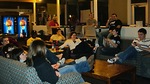 Candid, color photo of students gathered together to watch Super Bowl XLV. The students are sitting on various chairs and sofas. Some people are talking while others are looking at their phones.