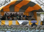 Candid, color photo of a musical group performing at Celebration festival. They are set up on a performance stage that is covered by a yellow and white striped awning. There are chairs set up for the audience in which there are two people visible carrying umbrellas.