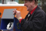 Color, candid photo of a man showing off a rabbit in a box. The man is wearing a red shirt, print tie, and a gold watch. The box containing the rabbit is painted blue. The rabbit has black and white fur.