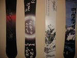 Color photo of four snowboards displayed on a wall at the Undergraduate All Student Show reception. From the left, the first board is red and black and has script written on its face. The next board is black and has a white circle radiating from the middle. It has white writing on its face. The third board is white and black and has script written on it. The last board is white, blue, and black and shows a view of a mountain range with blue sky above it. There is writing over the imagery.
