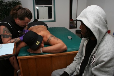 Candid, color photo of a tattoo artist tattooing an outline on the tattoo receiver's upper back. The tattoo artist is seen wearing purple gloves and holding a tattoo gun in one hand and a paper towel in the other. They are seen in the left side of the photo wearing a black sleeveless tank top with their brown hair pulled back. The tattoo receiver is lying shirtless face down on a table getting a tattoo on their upper back. They are wearing a black ball cap and black pants. There is a man sitting in front of the table wearing a ball cap with a grey hoodie pulled over the top of the cap.