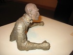 Color photo of a metal sculpture of torso and head of a man shown at the Undergraduate All Student Show reception. The man is made of a bronze-colored metal is shown with his hands in fists in front of his body.