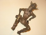 Color photo of a metal cowboy sculpture at the Undergraduate All Student Show reception. The cowboy is made of a bronze-colored metal and is shown wearing a cowboy hat and cowboy boots.