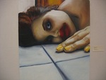 Color photo of a painting of a woman with exaggerated features shown at the Undergraduate All Student Show reception. The woman has her face pressed to the tile floor. Her lips are red and highly exaggerated in shape and size. Her hand is lying on the tile next to her face. Her nails are painted a bright yellow.