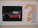 Color photo of two informational graphics representing Lewis Black: Money for the Poor. The graphic on the left is black, white, and red and has information regarding lower income populations. The graphic on the right has the same information as the infographic on the left but is printed in white, grey, and yellow.