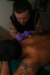 Candid, color photo of a tattoo artist tattooing an outline on the tattoo receiver's upper back. The tattoo artist is seen wearing purple gloves and holding a tattoo gun in one hand and a paper towel in the other. They are wearing black, sleeveless shirt and have their brown hair tied back. The tattoo receiver is lying shirtless face down on a table getting a tattoo on their upper back.