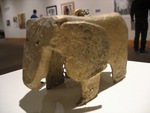 Color photo of a metal elephant at the Undergraduate All Student Show reception. The elephant looks to be made out of hammered metal and is tan in color. On the top of the elephant, there is a chain link that is connected to the piece and the chain is hanging down.