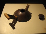 Color photo of a metal and wood art piece at the Undergraduate All Student Show reception. The piece is composed of a metal circle with a hole cut from the top that has a wooden and metal handle coming out of the side. On the other side of the metal circle, there is a short metal pipe sticking out. There is a cap off to the side meant to plug the cut out on top of the metal circle.