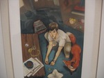 Color photo of a realistic art piece at the Undergraduate All Student Show reception. The piece shows a person squatting down on the floor and there is an orange fox circling their legs. They are surrounded by furniture, papers, a watch, a coffee cup, and other items.