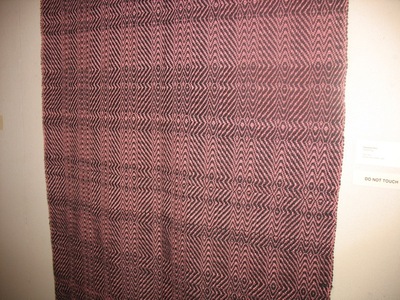 Color photo of a woven, textile art piece at the Undergraduate All Student Show reception. The fabric is woven into wavy lines with pink and black material. The piece is around the size of a blanket.