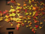 Color photo of a hanging art instillation at the Undergraduate All Student Show reception. The sculpture is made of metal leaves in shades of red, orange, and yellow. The metal is carved to look geometric in shape.
