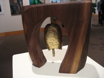 Color photo of a hammered metal and wooden bell structure at the Undergraduate All Student Show reception. The frame is made of a dark wood and curves around a hammered metal bell in the middle.