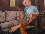 Color photo of a realistic style painting of a human with hands for all of their appendages. This art piece was displayed at the Undergraduate All Student Show reception. The humanoid figure is sitting in a chair in front of a grey sofa. The figure has its legs crossed.