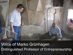 Candid, color photo of Professor Marko Grunhagen standing in the Kurdish Textile Museum in Iraq. He is standing in front of a man sitting on the floor who is working with textiles. There are fabrics attached lining the walls in the background. Professor Grunhagen is wearing a blue short-sleeved button up and jeans and is carrying a notepad in his hand. The man sitting on the floor is wearing a plaid long-sleeved button up and green pants. He is sitting in front of an apparatus that is connected to yarn. There is a text box over the photo that reads "Voice of Marko Grunhagen - Distinguished Professor of Entrepreneurship".