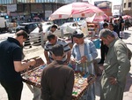 Candid, color photo of merchants in Erbil, Iraq. There are multiple people standing around a table that has jewelry spread out over the top. There are other merchants in the background selling other wares.